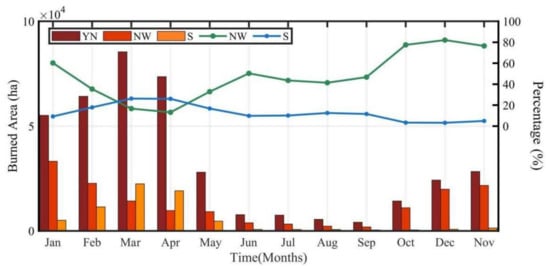 According to the above numerical results, the low-fire months in the three regions are June, July, August and September. However, there is a significant difference between region NW and other two regions in the high fire months. Except for region NW, the temporal distribution of burned areas in Yunnan and region S are similar on the seasonal scale. This may be because region NW belongs to part of the Qinghai–Tibet Plateau. Therefore, its climatic characteristics are quite different from other parts of Yunnan []. According to the results of burned area percentage, it can be seen that regions NW and S are the regions that are more prone to forest fires in Yunnan, which is consistent with the results of Figure 5.