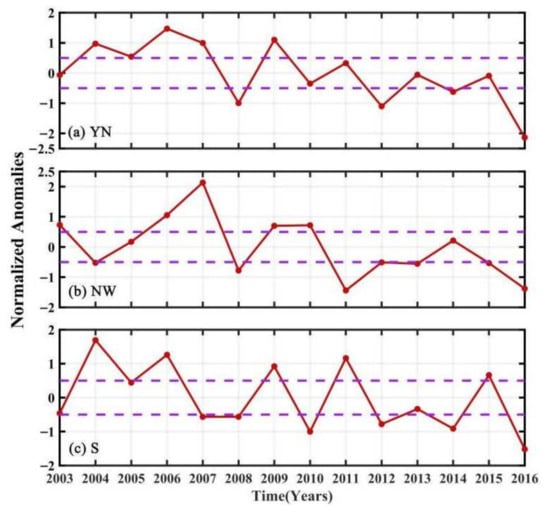 The temporal evolution of annual burned area normalized anomalies (red solid line) for the period of 2003–2016 in Yunnan (a), region NW (b) and S (c). The purple dashed line denotes the ±0.5 standard deviation. The normalized anomalies mean that the time series of burned area was standardized.