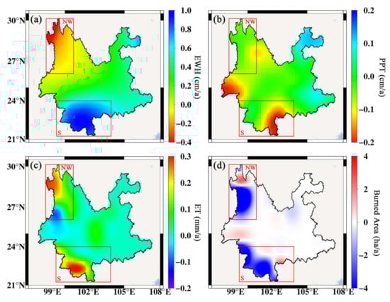 To analyze the influence of climate change on forest fires in Yunnan, we estimated the spatial distribution of the long-term trend changes of GRACE TWSC, PPT, ET and burned area (Figure 8). We found that there is no significant trend in TWSC in most of Yunnan, and only regions NW and S show significant trend changes. Among them, TWSC in region NW shows a decreasing trend, while the one in region S shows an increasing trend. The long-term trend changes of PPT are consistent with the ones of GRACE TWSC in most regions, but there are significant differences in region S and western Yunnan. In regions NW and S only, there are significant growth changes in ET. Combining Figure 8a–c, it can be seen that due to the influence of climate change in region NW, no change in PPT and ET increased, so TWSC shows a decreasing trend, which creates a natural environment prone to forest fires. In addition, the increase in ET may reduce the water content of the vegetation itself, making the vegetation easier to burn. In region S, there is also a decrease in PPT and an increase in ET. However, TWSC shows an increasing trend. This may be related to the main stream of the Mekong River flowing through this region. The annual runoff of this river ranks ninth in the world, and runoff is an important part of TWSC []. From Figure 8d, we found that, similar to TWSC, PPT and ET, only regions NW and S have significant change trends in burned areas. The burned area shows a decreasing trend in most of these two regions. This is closely related to the active forest fire prevention measures adopted by the local government [,]. However, the burned area shows an increasing trend in some local regions, such as parts of western, northwest and southern Yunnan.