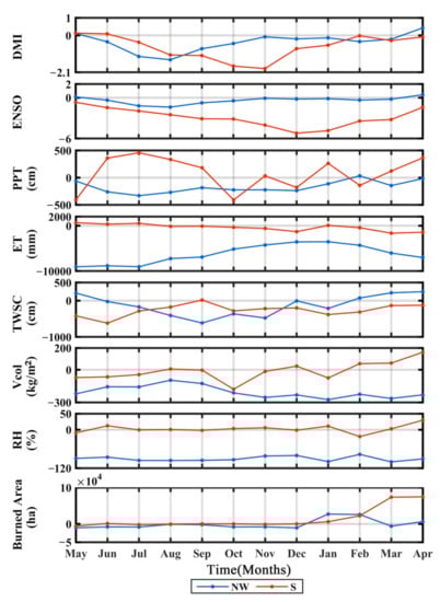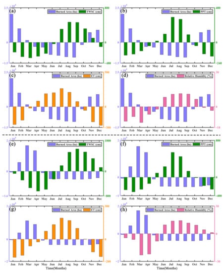 We also compared the monthly burned area with monthly TWSC, PPT, ET and relative humidity in region S (Figure 9e–h). In this region, the maximum burned area (16,750.48 ha) appears in September, while the minimum one (−5202.83 ha) occurs in March. We can see that there are similar relationships between burned area and TWSC, PPT, ET and relative humidity. In other words, like in region NW, the positive burned areas generally occur in the months with negative TWSC, PPT, ET and relative humidity, while the negative ones appear in the months with positive TWSC, PPT, ET and relative humidity. From Table 4, the correlation coefficients between burned area and TWSC, PPT, ET and relative humidity are −0.73, −0.51, −0.35 and −0.92, respectively. However, we found that the correlation between burned area and ET is weaker than the one in region NW. Relative to region NW, the correlations between burned area and TWSC and relative humidity are stronger, while the one between burned area and PPT are weaker. The three above correlation coefficients are smaller than −0.5.