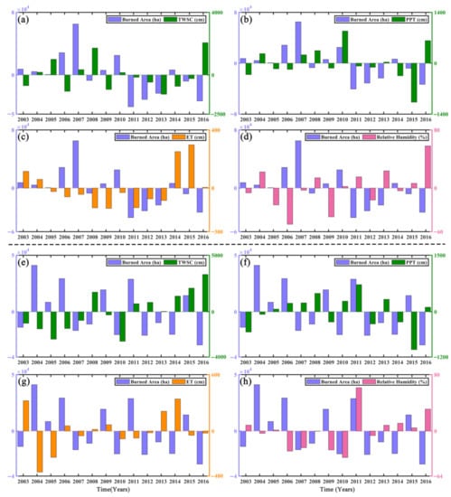 Figure 9 shows the seasonal variations of TWSC, PPT, ET, relative humidity and burned area in region NW (a–d) and S (e–h) from 2003 to 2016. In the figure, PPT, ET, relative humidity and burned area data are the related change values (with the average value deducted). In Figure 9a, the monthly average TWSC in region NW is 1.61 cm, the maximum one (470.13 cm) appears in August and the minimum one (−359.99 cm) occurs in March. The monthly average burned area in region NW is approximately 0 ha, the maximum one (20,463.01 ha) occurs in January and the minimum one (−10,836.32 ha) appears in September. We found that the burned area change is positive in the months with the negative TWSC (from July to October), while the it is negative in the months with the positive TWSC (from December to March). The correlation coefficient between burned area and PPT on the seasonal scale was estimated and its value is −0.57 (see Table 3). This explains that burned area and TWSC have a strong negative correlation on the seasonal scale.