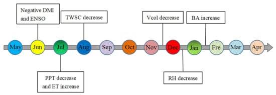 The changes of forest fires in Yunnan have significant seasonality (Figure 6), and forest fires are mainly affected by wet and dry climates []. In Yunnan, the dry season is from November to April of the following year, and the rainy season is from July to September []. The forest fires in this region are mainly concentrated in the dry season. The high-fire months in region NW and S are November–February and February–April, respectively. In the dry season, the decrease in PPT causes the ET of forest vegetation to decrease, thus atmospheric water vapor drops to a lower level (Figure 11) []. When the atmospheric water vapor is at a low level, the relative humidity is also relatively small (Figure 11). The lower relative humidity level creates a climatic condition more favorable for forest fires [].