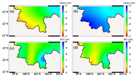 The spatial distribution of GRACE TWSC and PPT for the differences between high- and low-fire years in region S. The left and right column show the monthly average of GRACE TWSC (a,b) and PPT (c,d) in high- and low-fire years, respectively.
