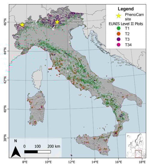 Overview of the study area showing location of PhenoCam sites used for validation and the spatial distribution of forest types plots classified using EUNIS level II classification (T1: broadleaved deciduous forest; T2: broadleaved evergreen forest; T3: needleleaved evergreen forest and, T34: needleleaved deciduous forest). PhenoCam data source: https://phenocam.sr.unh.edu/webcam (accessed on 11 March 2021).