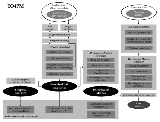 Flowchart of the main phases of the procedure to generate phenological metrics datasets and to perform multivariate statistical analysis. White ellipse refers to input data, grey boxes refer to data processing phases, black ellipses refer to output products.