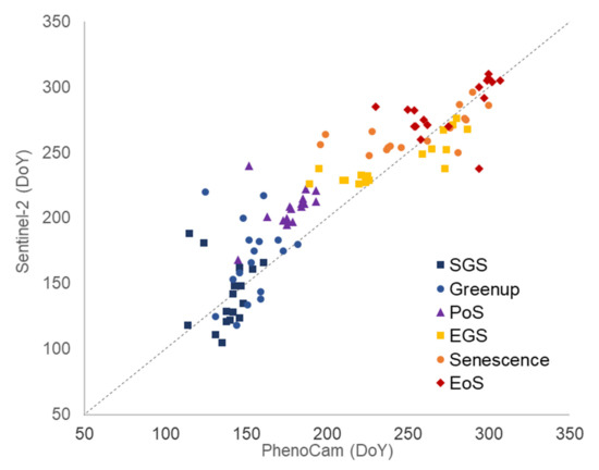 Two EGS dates clusters can be observed in Figure 5, likely related to the differences between tree species and grasslands, the latter characterized by an early yellowing phase. PoS DoY estimated from S2 generally occurs later than the PhenoCam estimated one. This may be related to higher GCC90 signal saturation than LAI, and result in higher error metrics (Table 4) as compared to other assessed phenological metrics. Error metrics for DoS and LMP, estimated from a pair of phenological metrics estimates, may be higher than others due to the uncertainties in both greenup and senescence phenophases, that can increase error.