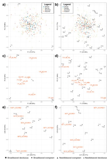 Biplots showing results of multivariate analysis. (a) Distribution of centers of gravity (black squares) for the EUNIS level II forest classes and LAI daily time series daily (colored dots) according to the first two DFA factors; (b) distribution of centers of gravity (black squares) for the EUNIS level III forest classes and LAI daily time series (colored dots) according to the first two DFA factors; (c) distribution of centers of gravity (black squares) for the EUNIS level II forest classes and LAI temporal statistics (colored dots) according to the first two DFA factors; (d) distribution of centers of gravity (black squares) for the EUNIS level III forest classes and LAI temporal statistics (red dots) according to the first two DFA factors; (e) distribution of centers of gravity (black squares) for the deciduous broadleaved (T1) forest classes and the sets of independent axes derived from CCA (red dots) according to the first two LDA factors; (f) distribution of centers of gravity (black squares) for the deciduous broadleaved (T1) forest classes and the sets of independent axes derived from CCA (red dots) according to the first and the third LDA factors.
