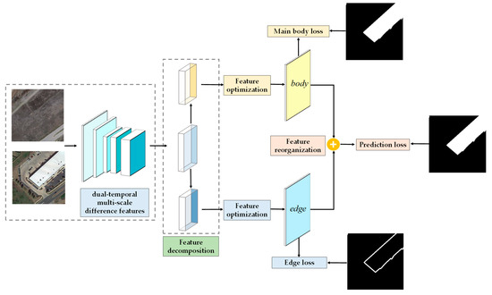 Herein, based on the successful application of the decoupling idea [25] in semantic segmentation, we introduce a feature decomposition strategy into building change detection, and add the feature optimization structure on this basis. Then, a fast and effective building change detection framework based on the feature decomposition-optimization-reorganization network (FDORNet) is proposed. FDORNet first decomposes the main body and edge features, and trains the network with the multiple supervision strategy. A feature optimization structure is used to optimize the main body and edge features and reduce the irrelevant information in the original image. Finally, a complete building change detection process is formed by feature reorganization and up-sampling operation. The main contributions of this paper are as follows:
