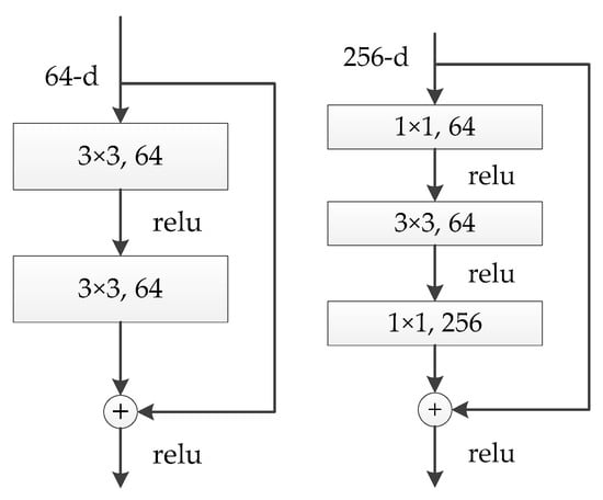 There are slight differences in the form of residual basic units in the ResNet framework with different depths. Figure 2 shows the two commonly used forms of the residual basic unit. The residual basic unit composed of two convolutional layers on the left is the basic module of ResNet34, and that containing three convolutional layers on the right is the basic structure of ResNet50, ResNet101, and ResNet152. Considering the feature extraction capacity, the number of model parameters and the model complexity, we build the feature extraction module in this work using ResNet50.