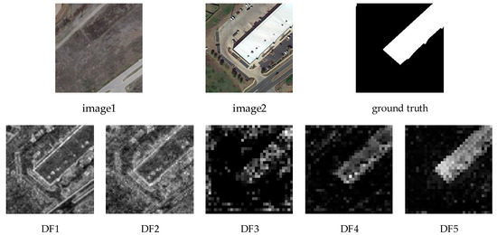 Building change detection is aimed at obtaining the final detection result. In the feature optimization part, only the important change information is retained during the precise optimization process, and the unchanged information and pseudo-changed information are filtered out. Feature reorganization is necessary to obtain a single binary map of change detection results. After and are obtained, the reorganized feature map is formed by a direct addition strategy. At this time, the size of the reorganized feature map is 2 × 128 × 128. Subsequently, to ensure that the main body and the boundary of the ground object in the final results are accurately connected during up-sampling of the reorganized feature, the feature maps with the 3 × 3 convolution and up-sampling operation is stacked again to increase the global consistency information. All of the above operations constitute a complete change detection process.