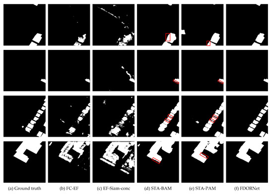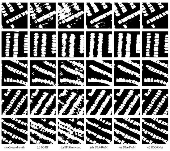 In the qualitative evaluation, Figure 8 and Figure 9 show the detection results of building areas with different density (e.g., medium and high density) in the form of color maps and binary change maps, respectively, which can intuitively display the detection effects of the above five change detection methods. Figure 8 illustrates the detection results in the building area with medium density. From left to right are the change detection result labels, the FC-EF detection results, the EF-Sima-conc detection results, the STA-BAM detection results, the STA-PAM detection results, and the FDORNet detection results. The green parts denote the changed areas correctly identified, and the red parts indicate the areas that are incorrectly recognized. As can be seen in the top two lines in Figure 8, FDORNet can better maintain the integrity of the ground object boundary and accurately identify large buildings. The last three lines show that FDORNet can better identify small buildings and describe ground object boundaries in more detail and accuracy.