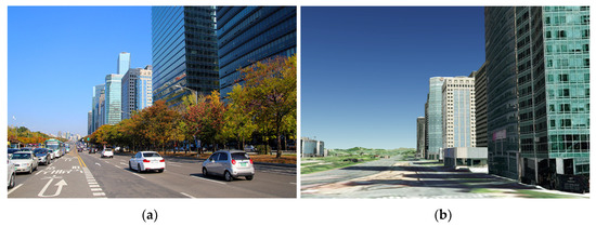 Differences between the real world and 3D city models: roads and buildings in (a) roads and the real world; (b) a 3D terrain and building model of Yeoui-daero, Yeongdeungpo-gu, Seoul, Republic of Korea.