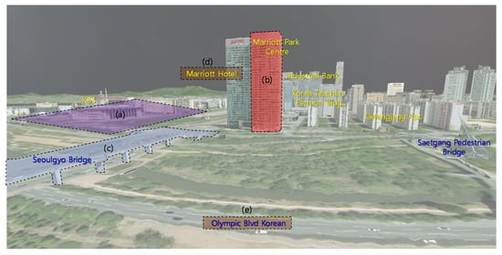 Example of the results of 3D rendering using our urban digital twin model: one of each type of layer data is indicated by the dotted lines. (a) A 3D terrain tile model generated by combining an aerial image and a digital elevation model; (b) a 3D building model; (c) a 3D bridge model; (d) facility name; (e) road name.