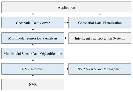 Objectification refers to the detection of individual mobility objects in two-dimensional (2D) RGB images, estimating their locations, and classifying objects such as pedestrians and types of vehicles, with the latter being able to distinguish between, for example, buses, cars, and trucks. Objectification converts high-capacity video data into low-capacity objectified data, enabling the storage and management of the locations, types, speed, or direction of moving objects. The network video recorder (NVR) interface module transfers the video data from CCTVs installed in a city to the multimodal sensor data objectification module. NVRs are devices that include hardware that can store data by connecting one or more Internet protocol (IP) cameras, and software that can control them and manage their video. Most NVRs provide a real-time streaming protocol (RTSP) interface, and each live video from IP cameras can be streamed through the RTSP application programing interface. Previously recorded videos can be requested from a specific camera ID or time zone; however, these video data come in large file sizes. For example, the XRN-1610A NVR equipment with a 32-terabyte (TB) hard disk drive and four XNO-6080R IP cameras used in this experiment can store approximately eight months of full high definition (FHD) video at 30 frames per second (FPS) from the four IP cameras. Approximately 1 TB is required to record monthly videos in FHD from an IP camera. Therefore, the proposed platform detects, analyzes, and stores only necessary CCTV video data using the NVR interface module. Furthermore, because data interface standards vary among different digital video recorder or NVR manufacturers, we developed an interface module for various NVR devices most commonly used in the Republic of Korea. When it is used in various fields in the future, the interface should be modified according to each product.