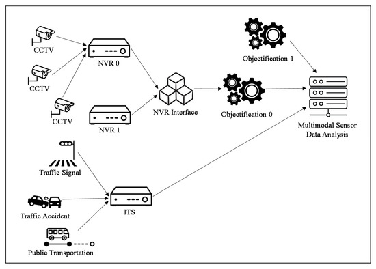 Figure 7 shows the data processing procedure that the proposed image-based multimodal sensor data objectification and analysis module uses. The module’s target data may use a different type of video sensor, such as a car dashboard camera, instead of a CCTV. One or more CCTVs is connected to one NVR, and one or more NVRs is linked to one NVR interface module. One NVR interface module is connected to an objectification module; one or more of the latter are, in turn, connected to a multimodal sensor data analysis module.