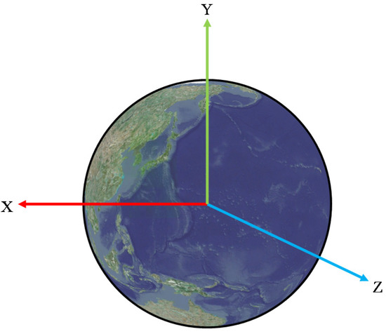 The origin of the coordinate system is the center of Earth, which is assumed to be a perfect sphere. The positive direction of the y-axis passes through the North Pole (latitude 90°), and the negative direction passes through the south pole (latitude −90°). The positive direction of the z-axis passes through latitude 0° and longitude 180°, and the negative direction passes through latitude 0° and longitude 0°. The positive direction of the x-axis passes through latitude 0° and longitude 90°, and the negative direction passes through latitude 0° and longitude −90°. The latitude and longitude coordinates were transformed into a three-dimensional coordinate vector using Equation (3) below [18]: