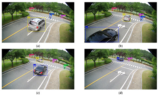 The action label can be granted one or more frames per object. For example, when a vehicle decelerates it may be classified as decelerating while moving forward within a lane, decelerating while changing lanes, or decelerating while turning left at an intersection. By integrating more than two action labels, it is possible to define the complex situation of an individual mobility object that is captured and detected in successive frames of one camera. Basic action labels can be combined to create new situations. For example, ‘forward + deceleration’ occurs when the vehicle decelerates while moving within the lane. ‘Lane change + deceleration’ means a case of decelerating while changing lanes. It can be used to determine the cause of, and responsibility for, an accident by complexly analyzing the behavior of individual vehicles, as shown in Table 5. In this case, road network data or traffic light sensor information are required. Therefore, public data from intelligent transportation systems are imported and used in the multimodal sensor data analysis module.