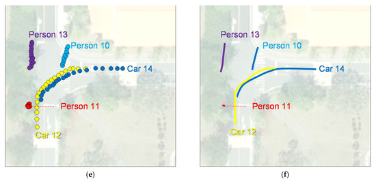 Figure 10 shows examples of the three types of individual mobility object data compression. To compare capacity, commonly stored information such as ID, time, start, and end points were excluded. Figure 10a–d shows approximately 1 MB per frame of FHD video, a total of 150 MB based on 150 frames. By sampling from 150 frames in which objectification was performed, 20 pieces of objectified data (ID, type, time, and location) were compressed as shown in Figure 10e. Figure 10f minimizes the capacity of the data sampled in Figure 10e to 8 bytes (double) × 4 = 32 bytes per object through the curve-fitting method [29]. In the curve-fitting method, the number of parameters is determined as four, or the value set by the user, per object. The parameter w is derived by performing polynomial curve-fitting using the two-dimensional coordinates (x, t) of the sampled data, as shown in Equations (4) and (5) below: