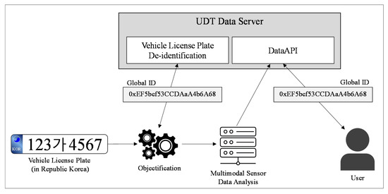 There are concerns and resistance to privacy violations. The development of information and communication technology has produced side effects such as the indiscriminate distribution of personal information and invasions of privacy. Our proposed platform, which is only in its initial stages, has the potential to be used for the latter. Therefore, in this study, we proposed a method to de-identify a vehicle license plate using a global ID, and another to manage the IDs. However, the proposed approach is experimental and we believe that the possibility of data leakage or information infringement is still high. However, such concerns do not go beyond the risks related to existing CCTV management systems. Therefore, we only considered the possibility of license plate information leaking within the current system of rights and restrictions related to the ability to access CCTV data. Figure 15 shows the data utilization pipeline of the proposed UDT platform.