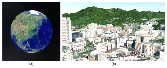 Google Earth is the easiest way for the public to access a 3D digitalized city [13]. Google Earth builds and provides 3D geospatial data for major global cities on a planetary scale. Users can experience different views of these cities, such as flying over them, just by searching Google Earth in an HTML5 standard-based web browser; no pre-installation is required. Cesium ion allows users to upload various 3D models of their own to a cloud server and place them on the surface of planetary-scale 3D geospatial maps [14,15,16]. VWorld provides the most precise 3D city model in the Republic of Korea [17]; unlike Google Earth or Cesium, it provides individual 3D building and facility models at a high resolution, and enables more precise city planning and simulation [18]. Having data on individual buildings or facilities enables the construction of networks and improves radio wave efficiency and fine dust simulation [19]. However, it is difficult to judge whether a city has been digitized when only 3D topography, buildings, and facilities are part of it. The most important component, the people, are currently missing.