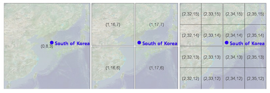 In this study, both static and dynamic geospatial data included location information. The unit of “tiles” is used to manage a large quantity of high-capacity data. A tile is the minimum unit in which geospatial data can be stored and managed. By managing data in this way, one can quickly search for and access the data desired using location information. Therefore, 3D geospatial platforms such as planet-scale Google Earth manage data as tiles [13,26].