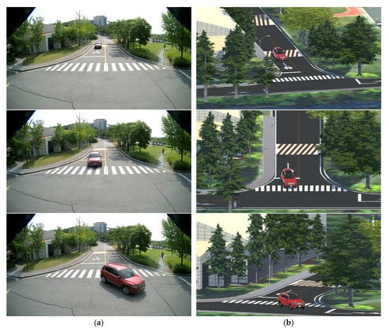 Dynamic geospatial data are those whose values change at regular intervals. They are typically collected from traffic lights around a city or sensors focusing on weather, temperature, humidity, fine dust, and traffic volume. In previous UDT studies, dynamic geospatial data collected from sensors were combined and used with 3D static geospatial data such as topography, facilities, and buildings. However, this creates a representation that differs from the city seen in real life. Figure 2 shows a city as it is in reality and in a 3D model. Although the terrain and buildings are similar, the biggest difference is the presence of vehicles. Although topography, buildings, and roads are the main components of urban spaces, the most important factor therein is people. Vehicles, bicycles, and motorcycles that people use daily for transportation are the main elements comprising a city.