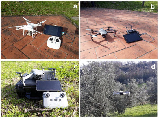 Used UASs: (a) Phantom 4 ADV; (b) Mavic 2 Pro; (c) Mavic Air 2; (d) Mavic Mini 2.