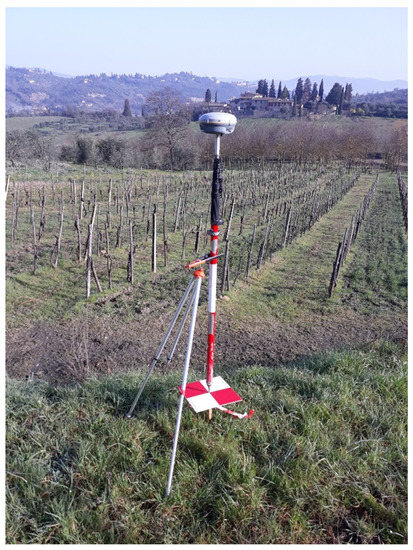 The used GNSS receiver was the TRIMBLE R8s (Figure 2) system with a 2 m high pole and bipod support to guarantee a steady equilibrium during acquisitions. The observations were made in real time kinematic (RTK) mode with area correction receiving nearest station (NEA) corrections from NETGEO’s (www.netgeo.it, accessed on 22 October 2021) permanent network (NRTK) [42]. A number of satellites higher than 12 were verified for each positioning, which was carried out with 3 acquisitions of 10 epochs each. In order to easily integrate the performed survey with other technical maps, the European Terrestrial Reference System ETRS89 in planar representation TM32 on the terrestrial reference frame ETRF2000 was chosen.