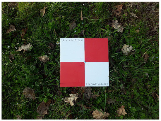 Furthermore, a topographic nail was solidly secured in each target’s center, allowing for an accurate GNSS survey. The targets’ coordinates were measured with GNSS observations using a 2 m stick. The observations made through local area correction with a local station were performed stationing on each point for three acquisitions of 10 epochs each. The average value of the three observations was considered for each GCP. An instrumental altimetric error of 15 mm and a 7 mm planimetric error were considered. The coordinates were transformed using a local grid and framed in the EPSG 3003 reference system (Gauss–Boaga west fuse). The targets (Figure 5) have been used as ground control points (GCPs) and check points (CkPs) to improve and verify the quality of the photogrammetric reconstruction.