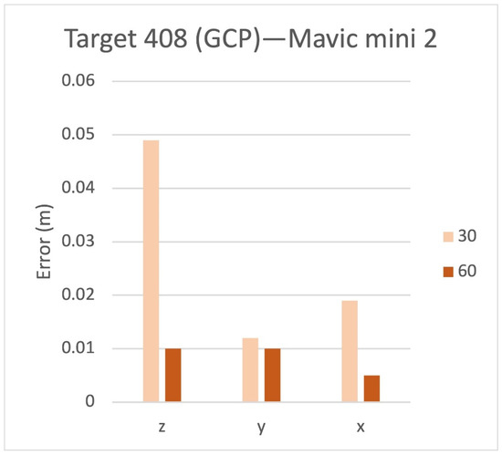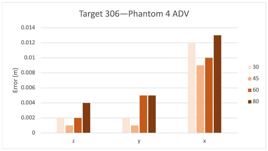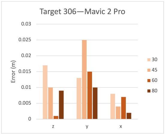 Figure 8 reports the residuals for the Z, Y, X axes and 30, 45, 60, 80 AGL meters for the Mavic 2 Pro on target 306. The values reported in the chart for each flight AGL represent errors on the CkPs.
