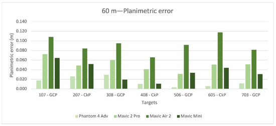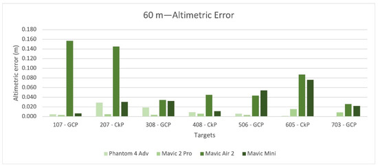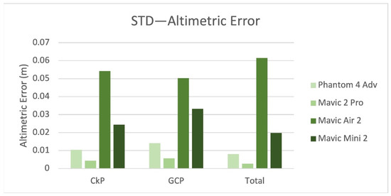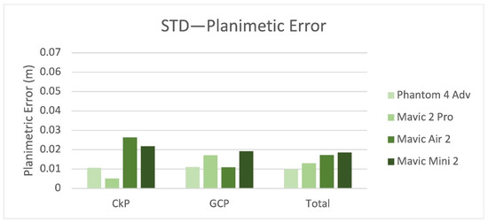 Figure 14 and Figure 15 show the medians for planimetric and altimetric errors on targets GCP (107, 308, 506, 703) and CkP (207, 408, 605). The median value for the altimetric error of the Mavic Air 2 is twice that of the others. Figure 16 and Figure 17 show the standard deviation for the planimetric and altimetric errors on targets GCP (107, 308, 506, 703) and CkP (207, 408, 605). Even in this case, the Mavic Air 2 had worse results.