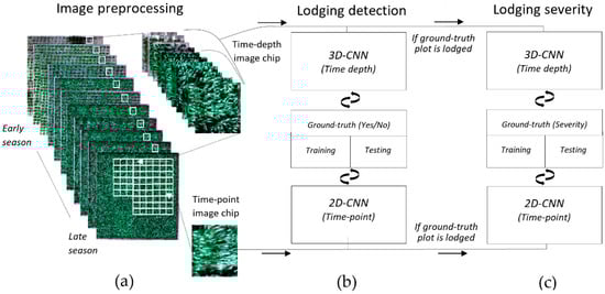 Schematic workflow for lodging assessment. Orthophotos stacking, extraction of time-depth image chips (top) and time-point image chips (bottom) (a). Implementation of lodging detection (classification) prediction based on time-depth 3D-CNN and time-point 2D-CNN modelling and ground-truth data as plots labeled as lodged or non-lodged (b). Implementation of lodging scoring (regression) using time-depth 3D-CNN and time-point 2D-CNN modelling approaches and ground-truth data as lodging severity scoring (c).