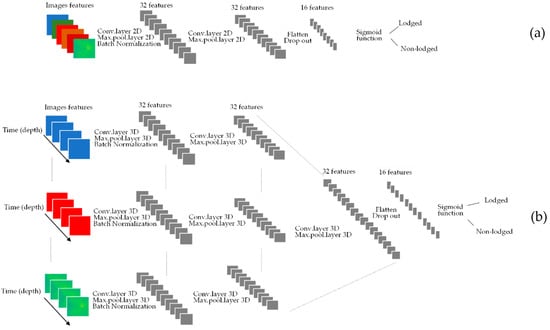 Diagram of custom CNN architectures utilized to assess lodging. The 2D-CNN (a) and 3D-CNN models (b) for lodging detection: CNN architectures for lodging severity can be found in itectures for lodging severity can be found in Supplemental Materials, Figure S1a,b.