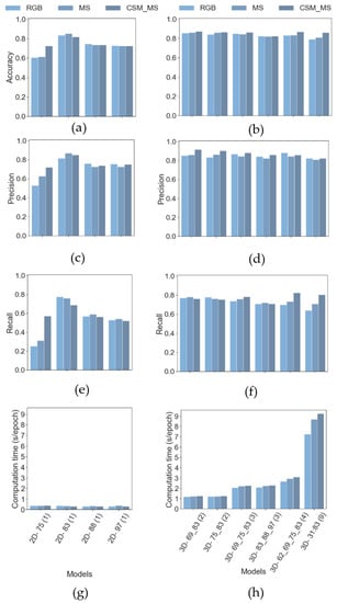 There were only modest effects on the OA of the 2D-CNN analysis when the number of image features was increased by adding multispectral or geometric information to RGB, except when analyzing pre-lodging images (75 DAP; Figure 4a). In that specific case, adding CSM data increased OA mainly by increasing Precision (Figure 4c), but also through gains in Recall (Figure 4e).