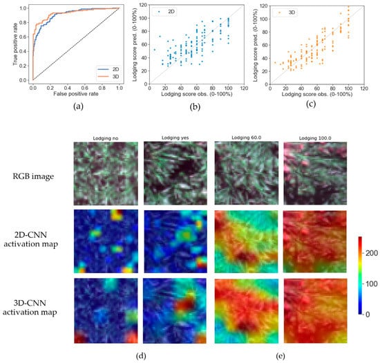 Evaluation of best CNN models on lodging detection prediction in testing dataset via ROC curves (a) and observed and predicted severity values for 2D-CNN (b) and 3D-CNN (c), respectively. Visual representation of activation maps of last max pooling layer of each CNN for lodging detection (d), and lodging severity (e) assessment. Example RGB image of plots (top), corresponding gradient activation maps of best 2D-CNN (middle), and best 3D-CNN (bottom) in testing dataset. The level of activation of CNN layers in the images is represented by low (blue), intermediate (yellow), and high (red) using an 8-bit (0–255) scale.