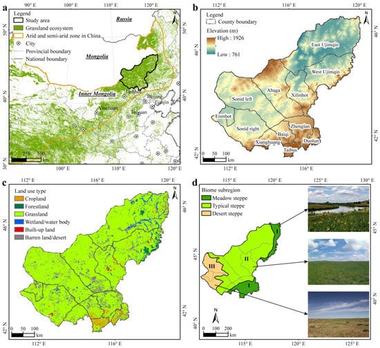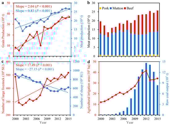 | Socioeconomic data | Statistical panel data | Annual statistical data for each county: grain production, meat production, number of livestock | - | 2000–2015 | Inner Mongolia statistical yearbook (http://tj.nmg.gov.cn/, accessed on 23 November 2021) |
