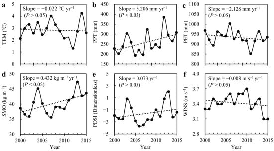 | Soil moisture (SMO) | Soil moisture content stored in shallow layer (10–40 cm) | 0.25° | 2000–2015 | Global Land Data Assimilation System (https://ldas.gsfc.nasa.gov/gldas/, accessed on 23 November 2021) | |