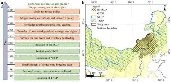 - Liu, M.; Dries, L.; Heijman, W.; Huang, J.; Zhu, X.; Hu, Y.; Chen, H. The impact of ecological construction programs on grassland conservation in Inner Mongolia, China. Land. Degrad. Dev. 2018, 29, 326–336. [Google Scholar] [CrossRef] [Green Version]