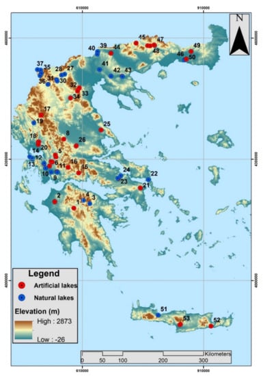 The study area includes 50 natural and artificial lakes (Figure 1; Table 1). These waterbodies comprise the National Monitoring Network of Waters in Greece, which is implemented by the Goulandris Natural History Museum, Greek Biotope/Wetland Centre (EKBY). More information about the general characteristics of the monitored lakes can be found in the study conducted by [], or more detailed data can be retrieved from the EKBY’s site (Goulandris Natural History Museum, Greek Biotope/Wetland Centre; http://biodiversity-info.gr/index.php/el/lakes-data#!IMGP4731; accessed date 5 February 2020).