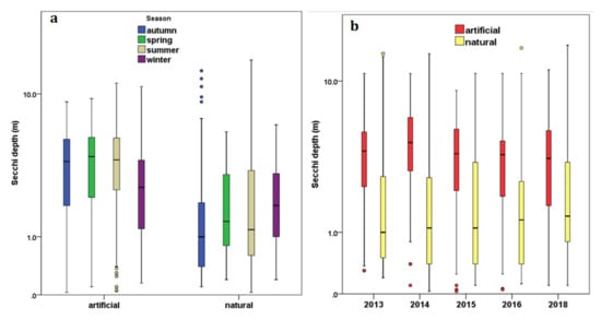 Boxplots presenting basic statistics of Secchi depths (a) grouped by the lake’s nature and categorized by the sampling season, and (b) grouped by sampling year and categorized by the lake’s nature.