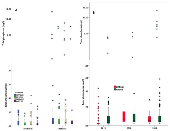 Total measurements of TP concentrations are 370, including the years 2015, 2016, and 2018 (Table 3). Minimum TP values are similar during all years (around 0.01 mg/L), while maximum values increase during these years. The same tendency is reflected based on average values, with the mean TP value of 2018 being double compared to the respective value of 2016. Higher TP concentrations are detected in natural lakes, particularly during autumn sampling months, while water sampling analysis in summer revealed the greatest TP concentrations in artificial lakes (Figure 3). As far as the yearly distribution of TP concentrations in Greek lakes is concerned, it is confirmed that natural lakes are more affected by TP pollution sources than the artificial ones with an increasing tendency throughout the years (Figure 3).