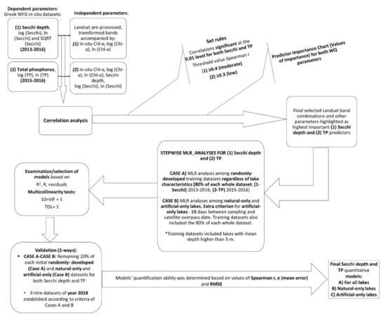 The hereby adopted methodological scheme includes the implementation of stepwise multiple regression (MLR) analyses among in situ measurements and satellite data. In situ data concern Secchi depths and TP concentrations along 50 lakes, included in the National Lake Monitoring of Greece (WFD), and since the majority of those data were recorded during 2013–2015, images of sensors Landsat 7 ETM+ and Landsat 8 were the exclusive choice for the implementation of this research. According to a previous study conducted by the authors [], a principal component analysis (PCA) indicated that the variance of Chl-a concentrations of the same lakes was affected by whether the lakes were natural or artificial, while the rest of the tested parameters were the climatic type, typology, and the sampling season. Hence, based on those PCA’s results, hereby MLR analyses concerned: (a) all in situ measurements of TP and Secchi depth during 2015–2016 and 2013–2016, respectively, and (b) in situ TP and Secchi depth datasets of the same years, including natural-only and artificial-only lakes. Correlation analyses were additionally conducted to explore and detect the existing interrelationships among TP, Chl-a concentrations, and SD of monitored lakes and improve the effectiveness of the WQ assessment models by indicating further significant predictors. Subsequently, Chl-a regression models developed by [], and hereby established TP and Secchi depth’s models were utilized to calculate the water trophic index of the studied lakes.