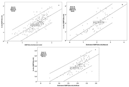 Scatter plots between in situ and estimated SQRT Secchi depths derived from (a) general model, (b) model established for natural lakes, and (c) model established for reservoirs (lines set at confidence intervals 95%).