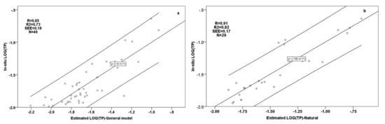 Training datasets regarding the in situ Secchi depths and TP include measurements of 2013–2016 and 2015–2016, respectively. It should also be noted that training and validation datasets contained lakes with mean depths higher than 5 m to surely avoid the bottom reflectance noise []. In particular, [] recommended that any pixel with a water column depth of 5 m or less should be characterized as optically shallow and omitted from the analysis in order to avoid any unwanted optically shallow effects apparent in satellite-derived products; WQ models and their efficiency in our case. The final results of the MLRs should be the development of rigorous quantitative algorithms regarding: (a) Secchi depth and TP for all the lakes, (b) Secchi depth and TP for natural lakes, and (c) Secchi depth and TP for artificial lakes.