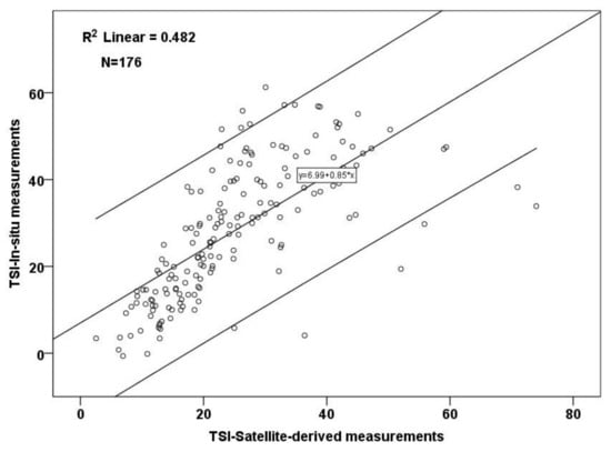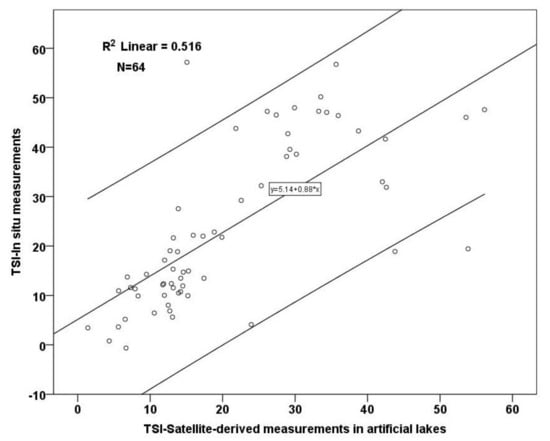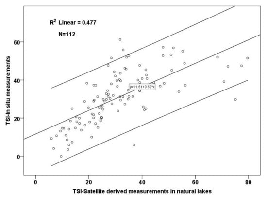 Based on these equations, the in situ TSI for all cases accompanied by available simultaneous in situ measurements of TP, Chl-a, and Secchi depths were also calculated. In the framework of the study conducted by [], through the harmonization of Landsat 7 ETM+ and 8 OLI images, three Chl-a quantitative models were developed, including the ratios of blue to green and red, red to green and blue, and the ln-transformed bands SWIR1 and SWIR2. Those models were established based on the same period and same lakes as the ones developed herein; Equation (6) concerns the calculation of Chl-a concentrations across all lakes, while Equations (7) and (8) regard the Chl-a assessment of natural-only and artificial-only lakes, respectively. Hence, taking into consideration those Chl-a models, we calculated TSI (Chl-a; Equation (3)) by using the equation being established regardless of the lake characteristics (Equation (6)), TSI (Chl-a) of natural lakes by employing the respective equation (Equation (7)) and TSI (Chl-a) of reservoirs by using the Chl-a equation, respectively developed (Equation (8)). Then we used the hereby developed models concerning the TP and Secchi depths for the calculation of satellite-derived TSI (TP; Equation (2)) and TSI (SDT; Equation (4)), respectively. After implementing Equations (2)–(5), satellite-derived TSI values were calculated and trophic state classification was conducted initially for the cases concerning all the lakes and then separately for the natural-only and artificial-only cases (by using the independent models). Validation of satellite TSI was carried out based on statistical analysis and the resulting deviation from the respective in situ TSI values.