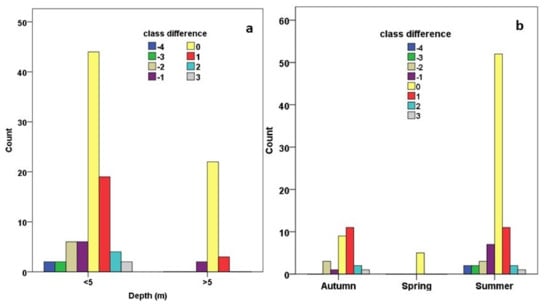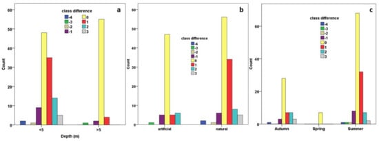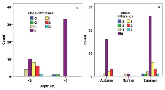 Secchi depths throughout the monitored Greek lakes were measured during the years 2013, 2014, 2015, 2016, and 2018 (Table 2). Minimum values ranged from 0.03 (2014, 2015) to 0.2 m (2013), while maximum values ranged from 11 (2015) to 15.5 m (2018). Mean values of Secchi depth are similar during all years and equal to around 3.2 m. Secchi depths are higher in artificial than in natural lakes, while the highest values are observed during summer months for both natural and artificial lakes (Figure 2). The temporal distribution of Secchi depths was categorized on the criterion of whether the lakes were artificial or natural; values were also higher in artificial lakes during all sampling years, with some exceptions (e.g., Trichonida Lake; Figure 2).