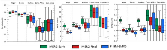 The right graph in Figure 5 illustrates the bias scores expressed in mm/day. Here again, the bias of IMERG-Early is much higher than the ones of IMERG-Final and PrISM. In Niger, IMERG-Early bias is close to 1 mm/day, i.e., about 360 mm/year for a mean annual rainfall of 600 mm. This is a considerable overestimation of the precipitation rate. In IMERG-Final the bias is decreased to 0.04 mm/day (i.e., 14 mm/year). Similarly, PrISM reduces the initial bias to −0.08 mm/day (i.e., −29 mm/year). In Benin, IMERG-Early shows a slight positive bias of +0.14 mm/day (i.e., 51 mm/year) while IMERG-Final bias is reduced to −0.05 mm/day (i.e., −18 mm/year) and PrISM bias is −0.23 mm/day (i.e., −84 mm/year). Similar results can be observed in Burkina Faso, where the initial positive bias of IMERG-Early is reduced in IMERG-Final and PrISM (from 0.58 to 0.08 and 0.10 mm/day, respectively). In Central and East Africa, results show also a positive impact of the PrISM methodology to correct IMERG-Early. The median bias of IMERG-Early decreases from 1.44 to 0.74 mm/day (PrISM) and 0.90 mm/day (IMERG-Final) in Central Africa and from 0.47 to 0.27 mm/day (PrISM) and 0.19 mm/day (IMERG-Final) in East Africa.