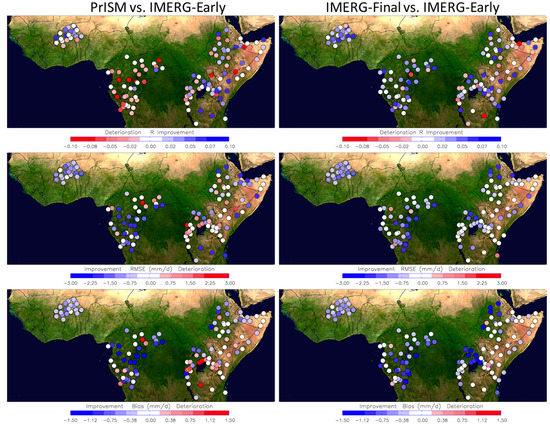 Evaluation of PrISM compared to IMERG-ER (left graphs) and IMERG-FR compared to IMERG-ER (right graphs) based on 140 rain gauges located in Burkina Faso, Central Africa and East Africa. Blue pixels indicate an improvement in scores (R (top), RMSE (middle), Bias (bottom)) while red pixels indicate a deterioration.