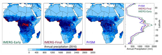 Annual rainfall amount in 2016 in Africa for IMERG-Early, IMERG-Final and PrISM. The right graph displays the latitudinal distribution of the annual rainfall amount.