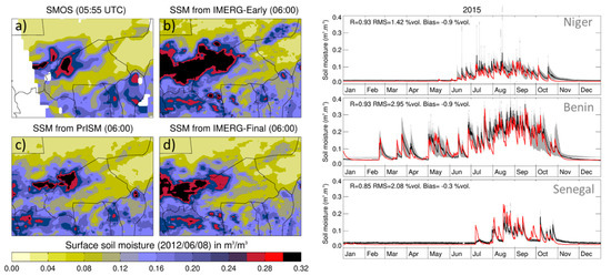 (Left) Spatial distribution of soil moisture on 2012, June 8th 06:00 around Burkina Faso from SMOS (a) and from simulated soil moisture using (Equation (1)) and IMERG-Early (b), PrISM (c) and IMERG-Final (d) precipitation products, respectively. (Right), the PrISM soil moisture product (red) is compared to in situ soil moisture measurements (black and gray) in Niger (13.65° N, 2.65° E), Benin (9.65° N, 1.65° E) and Senegal (15.45° N, 15.35° W).